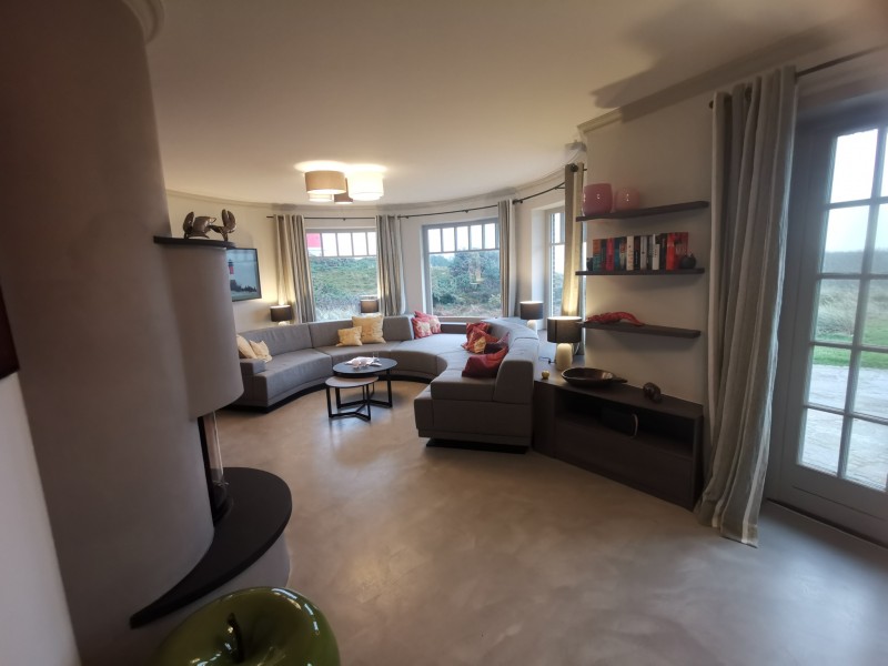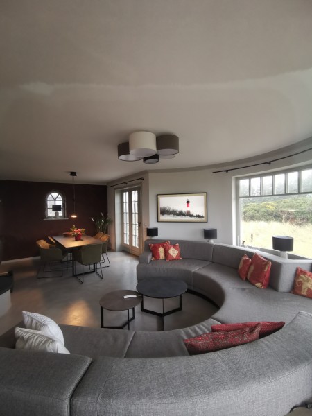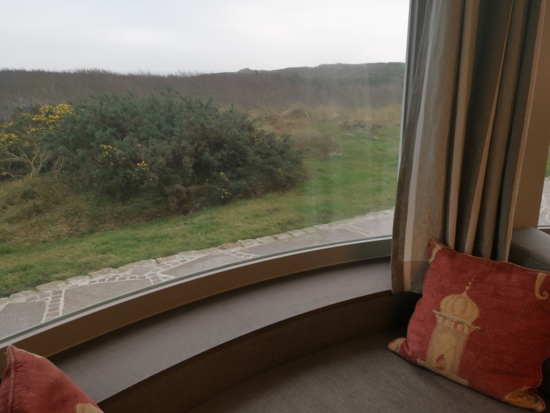 Blick aus den gerundeten Fenster auf die grosse Sonnenterrasse |