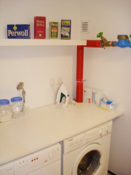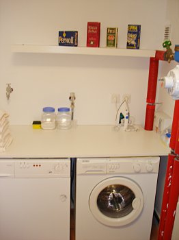Neben Waschmaschine und Trockner, Bügeleisen und Bügelbrett. Sogar Waschmittel ist vorhanden |